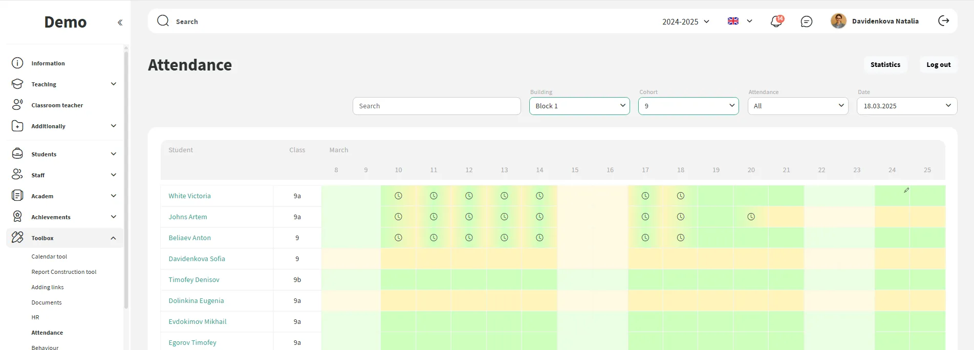At any time, you can see who is currently at school and who is outside — using filters or tags in the student list.