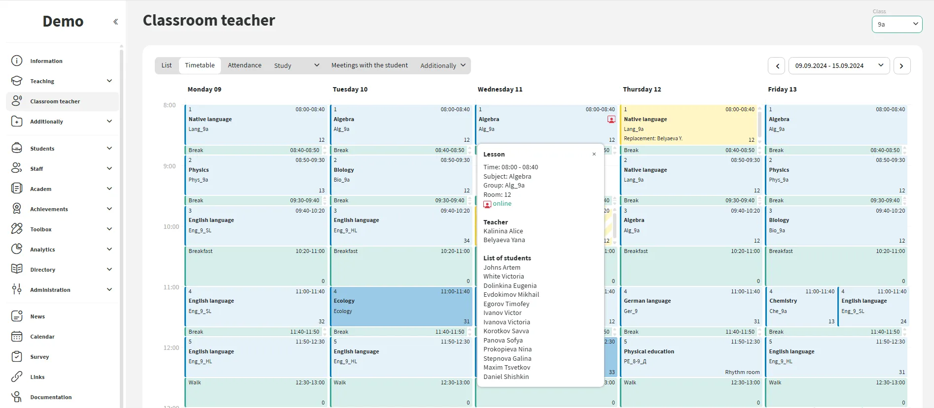 The mentor sees all assigned students and can quickly access their profiles: schedule, grades, activities, parent information — always at hand.