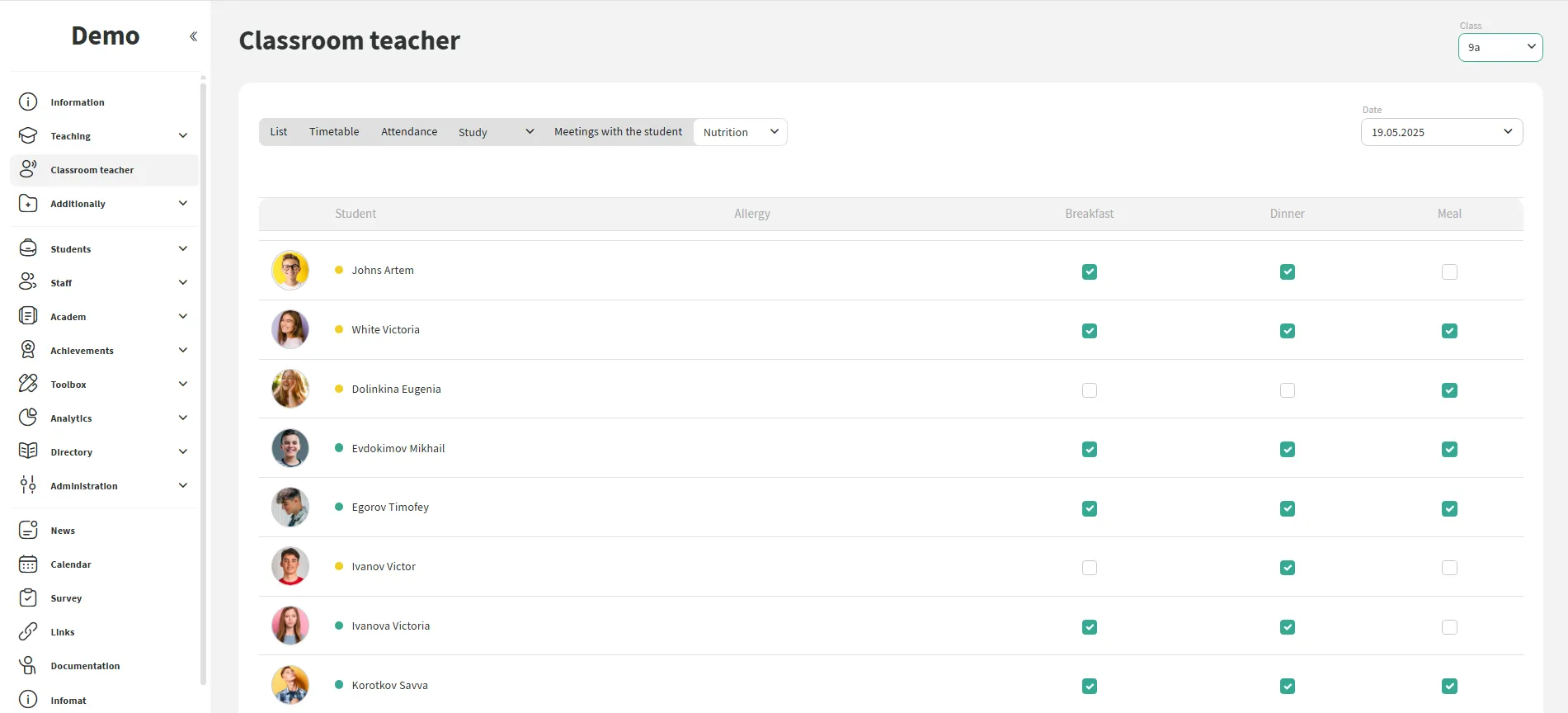 The mentor can mark whether the student has eaten and check the menu. Parents will see this information in their personal account.