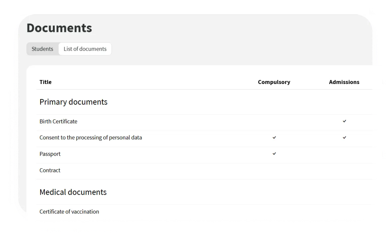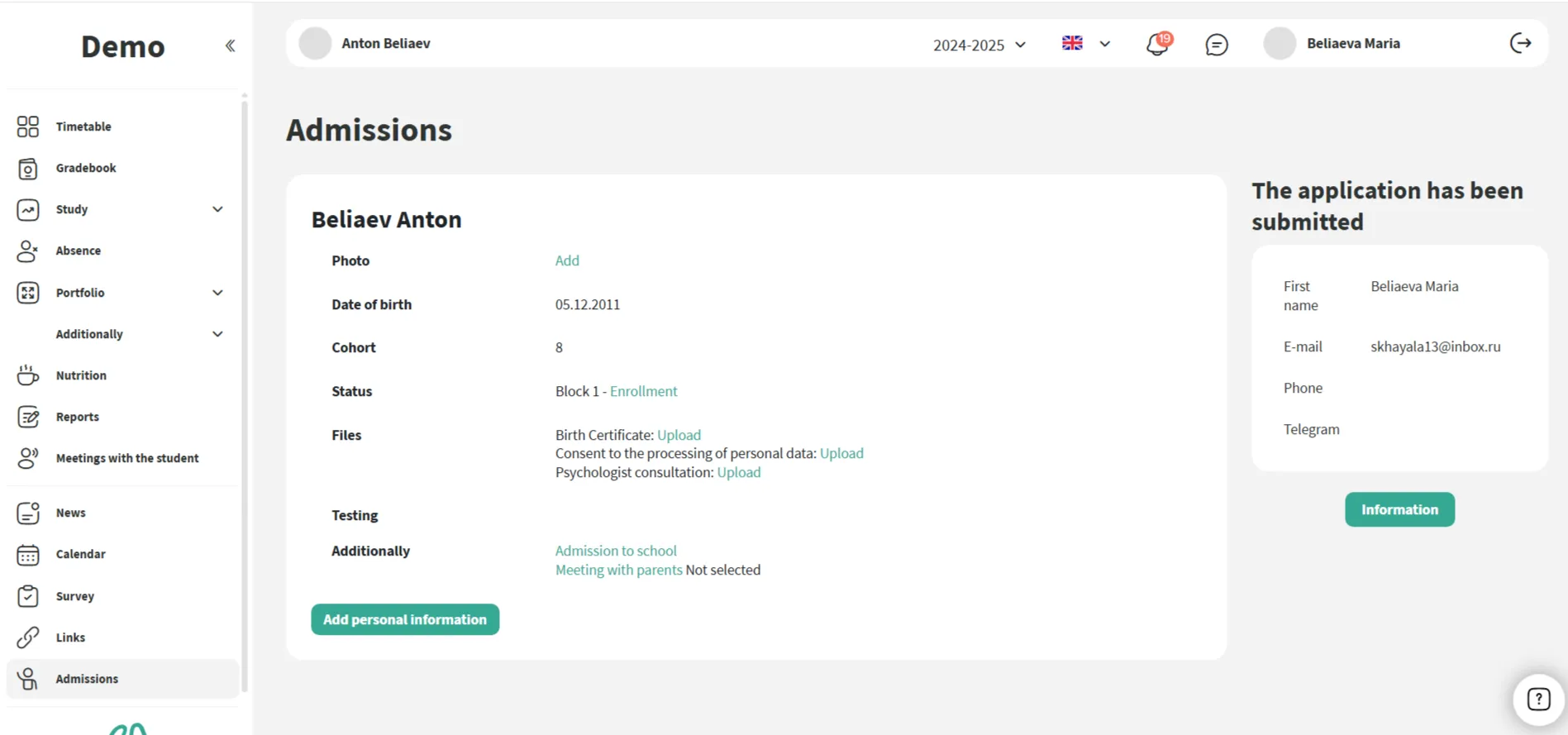 If the "Admission" module is used, parents can attach the necessary files themselves in their personal account — without adding extra burden on the administration.