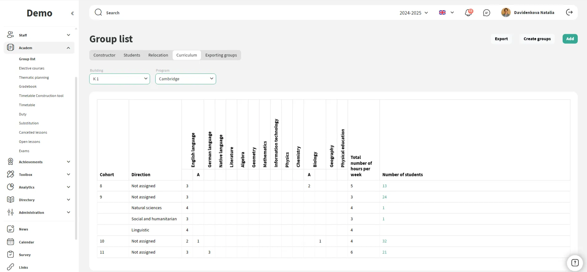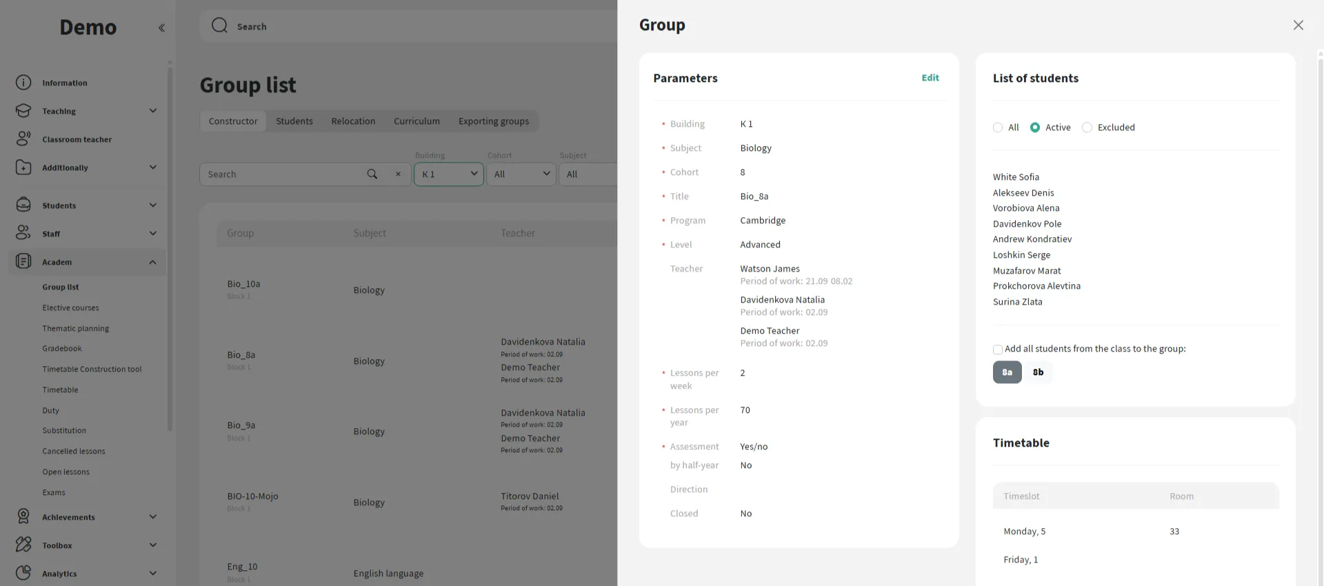 A group brings together students, teachers, and subject study parameters — level, curriculum, and number of hours. Groups can be homogeneous (all students from the same class) or mixed (from different classes and grades).