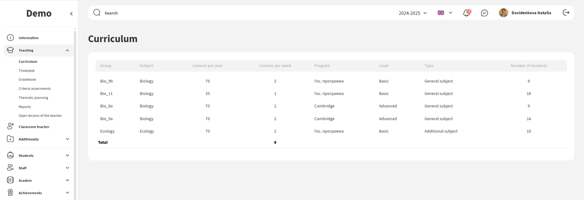 The teacher's workload is automatically calculated based on groups and curricula — it is visible in the teacher's personal account.