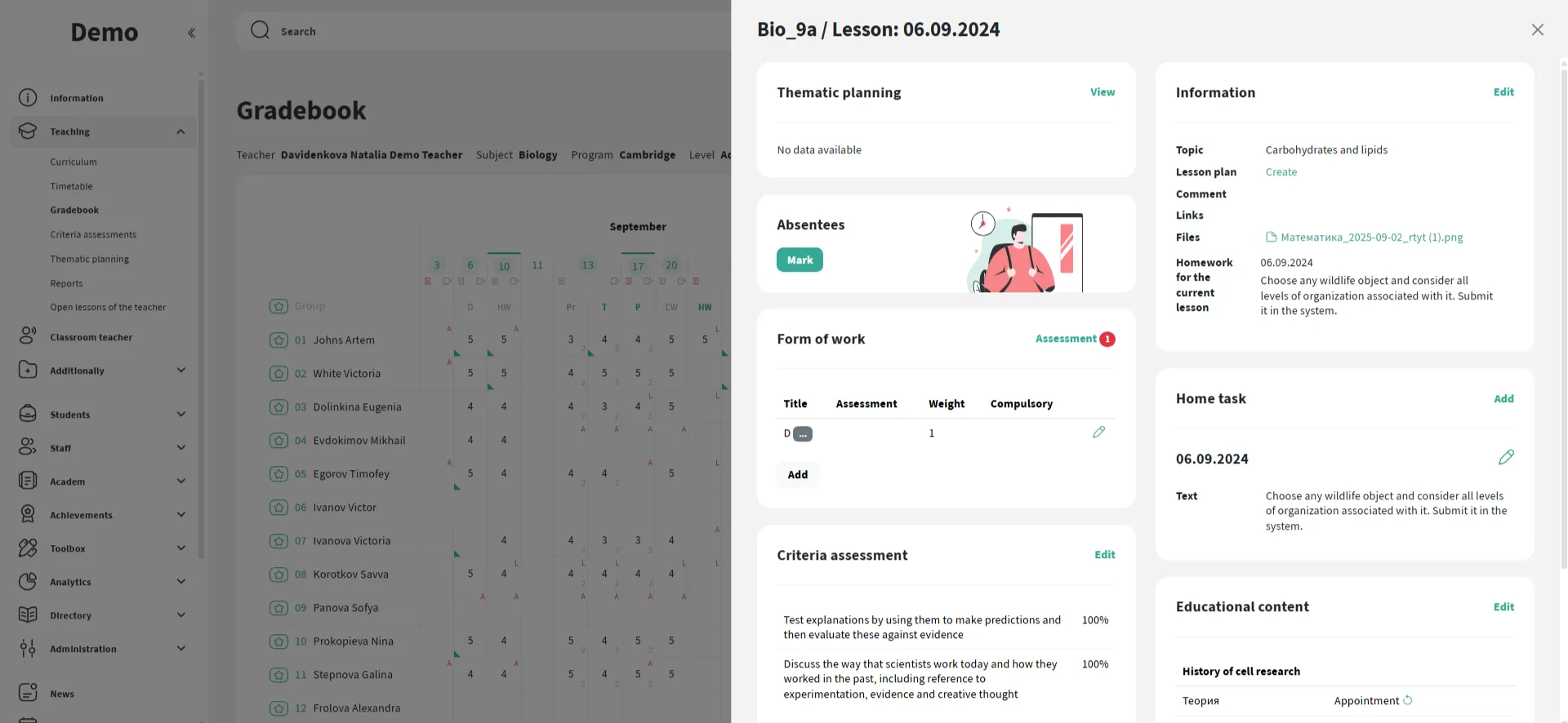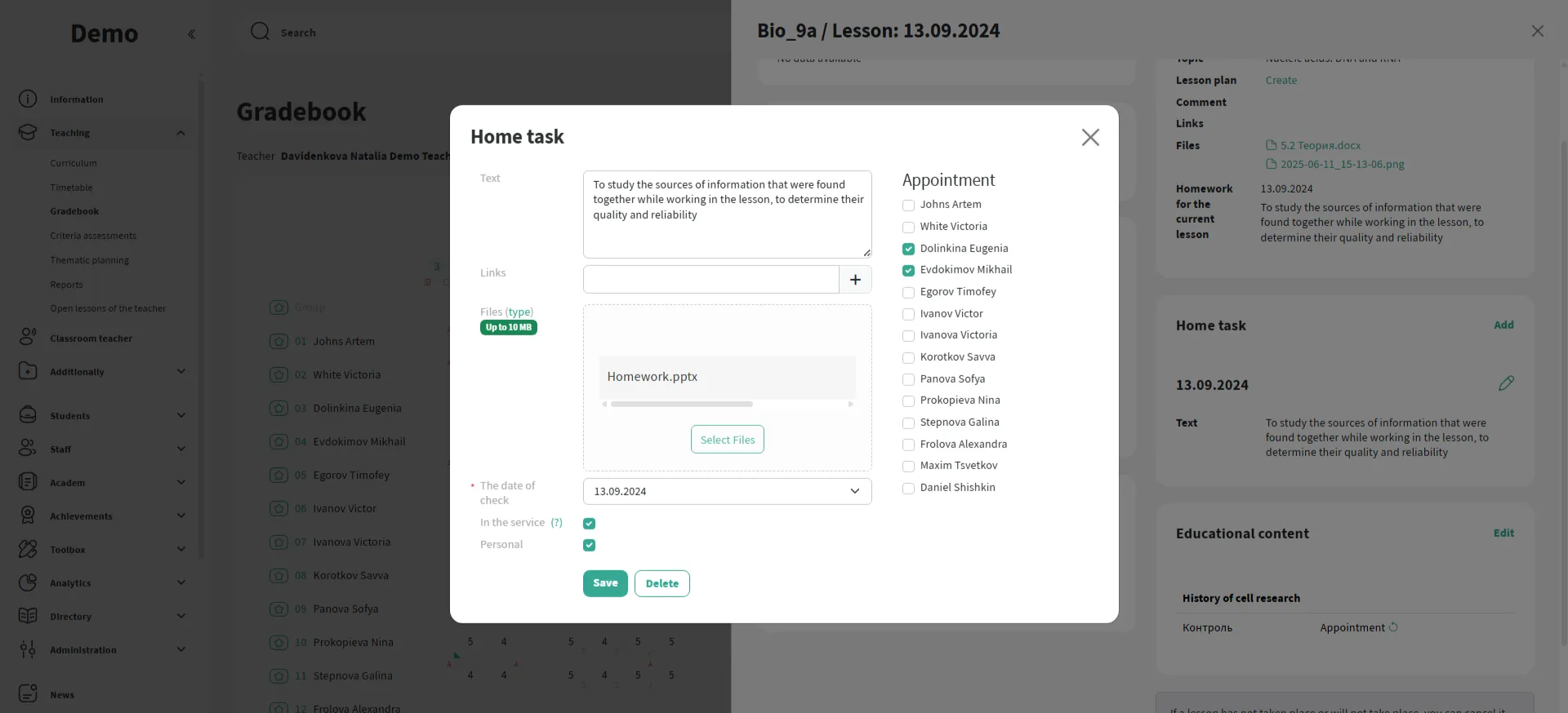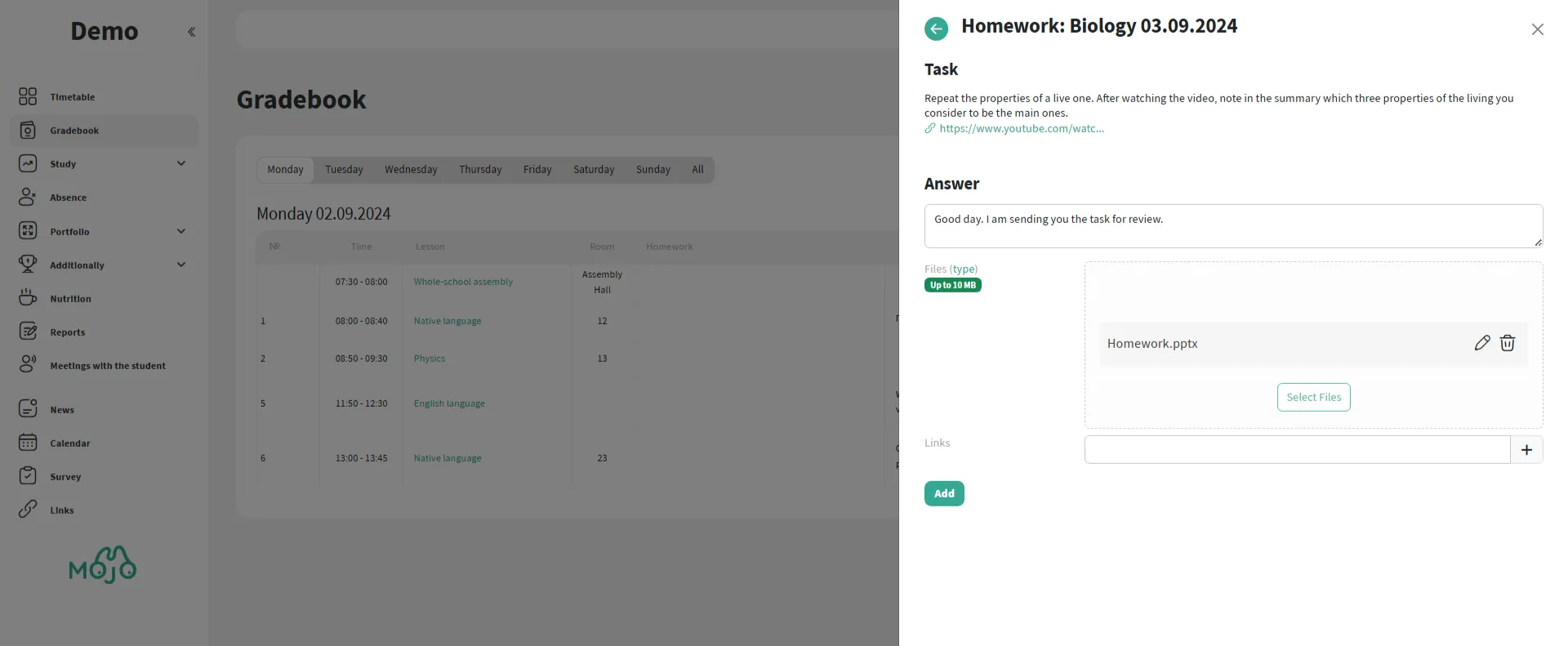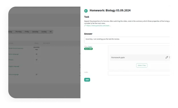 Enter the text, attach a file or link, specify the deadline — and the assignment will appear for students and parents.