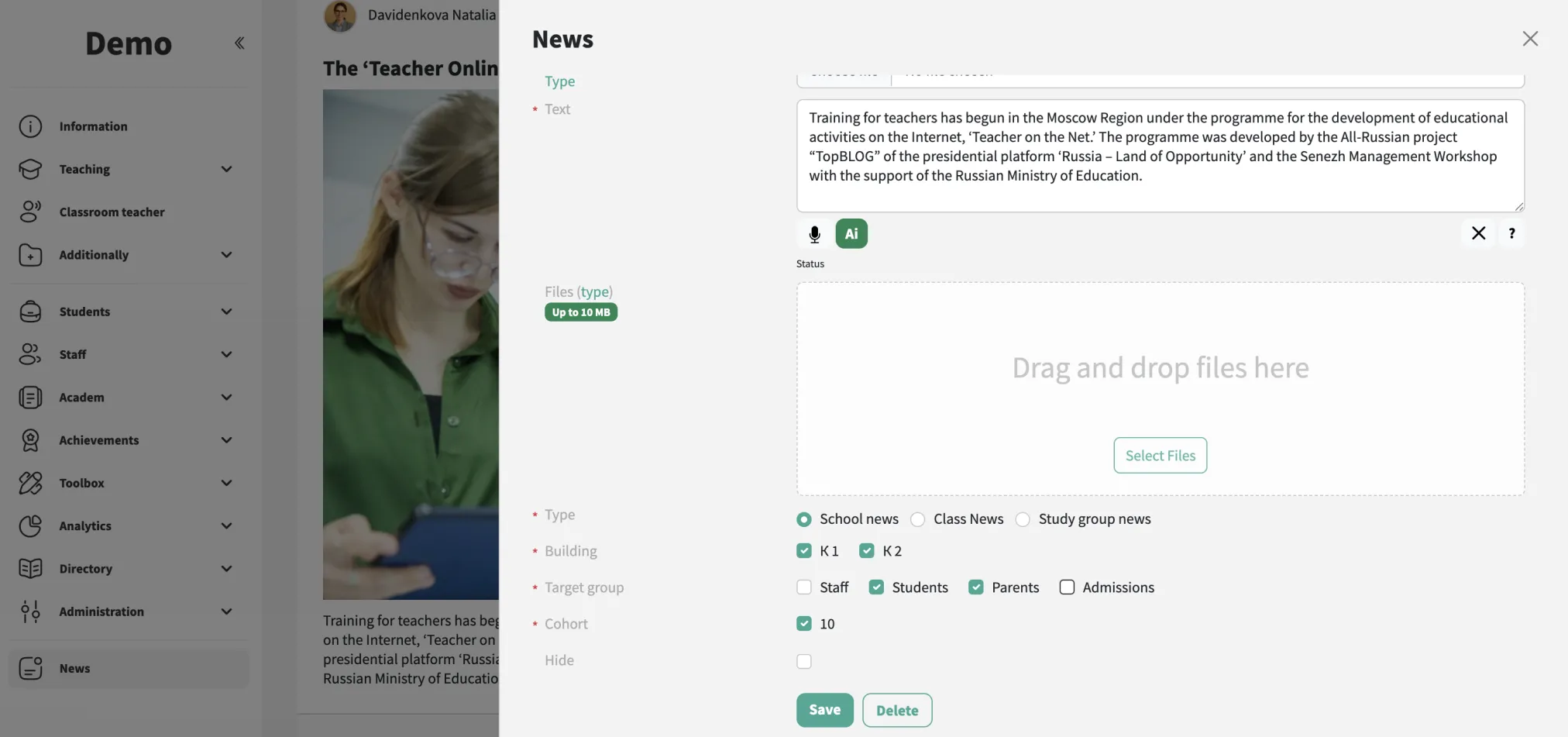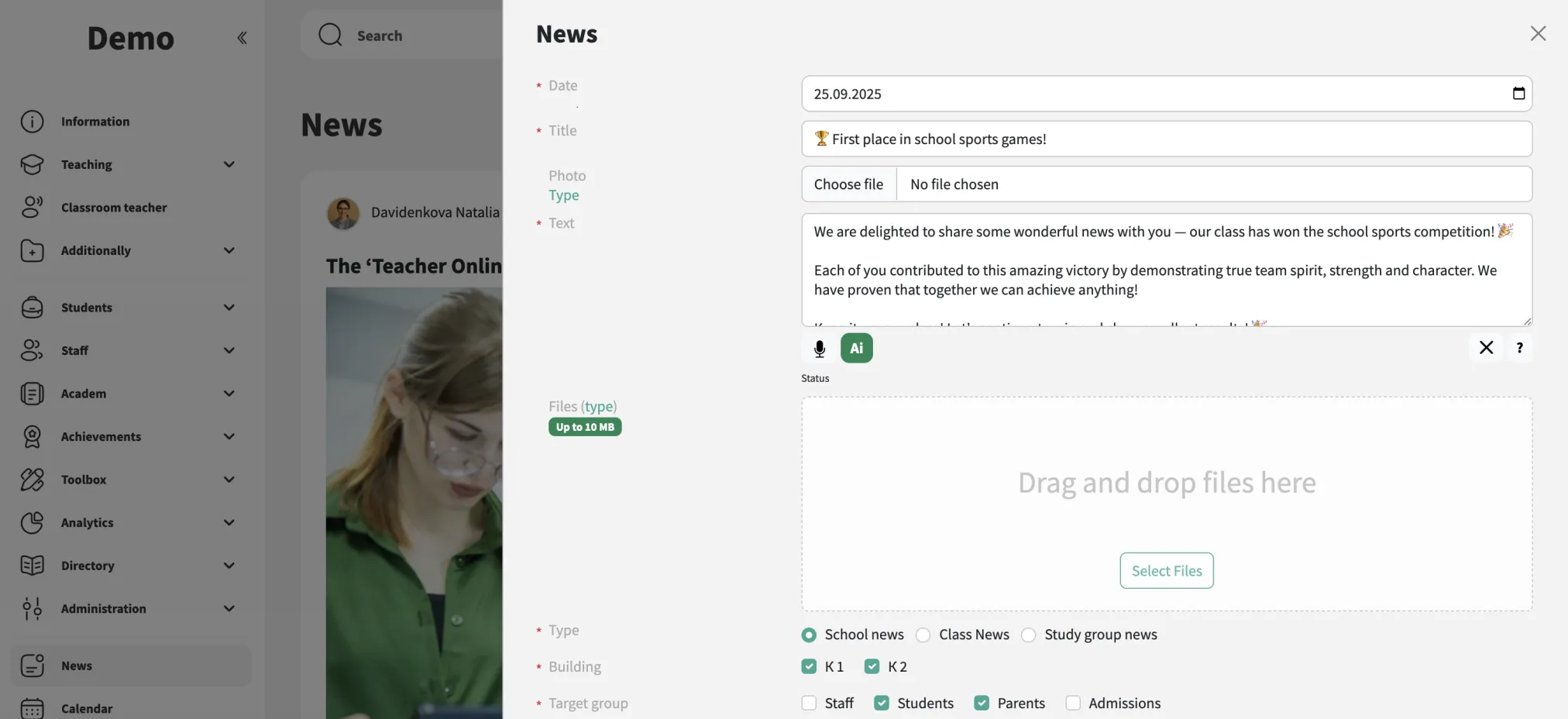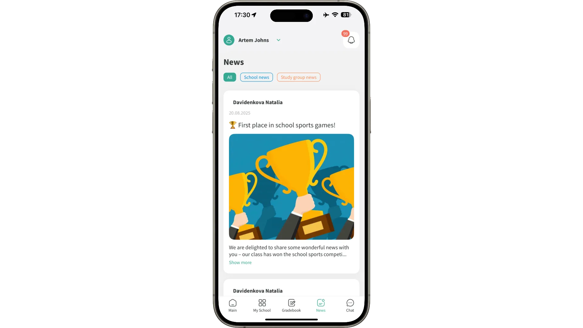 News is displayed not only in the web version but also in the mobile app. Parents, students, and teachers always stay up to date.