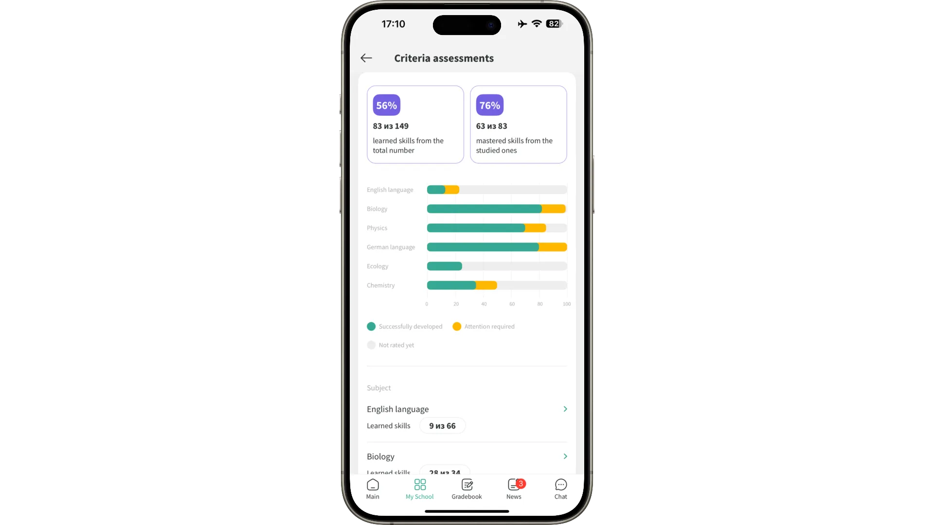 A transparent system for evaluating key skills and abilities: parents see which competencies their child is developing and the progress for each criterion.