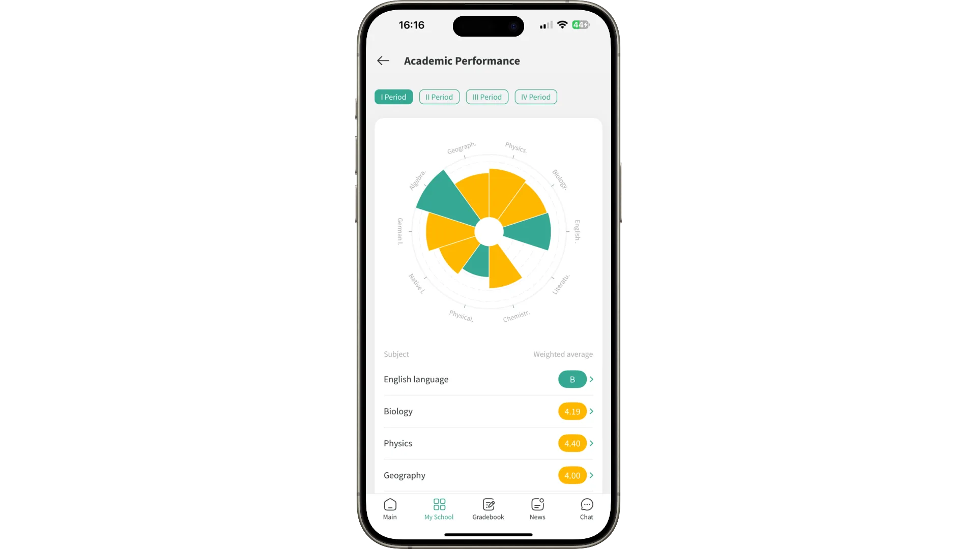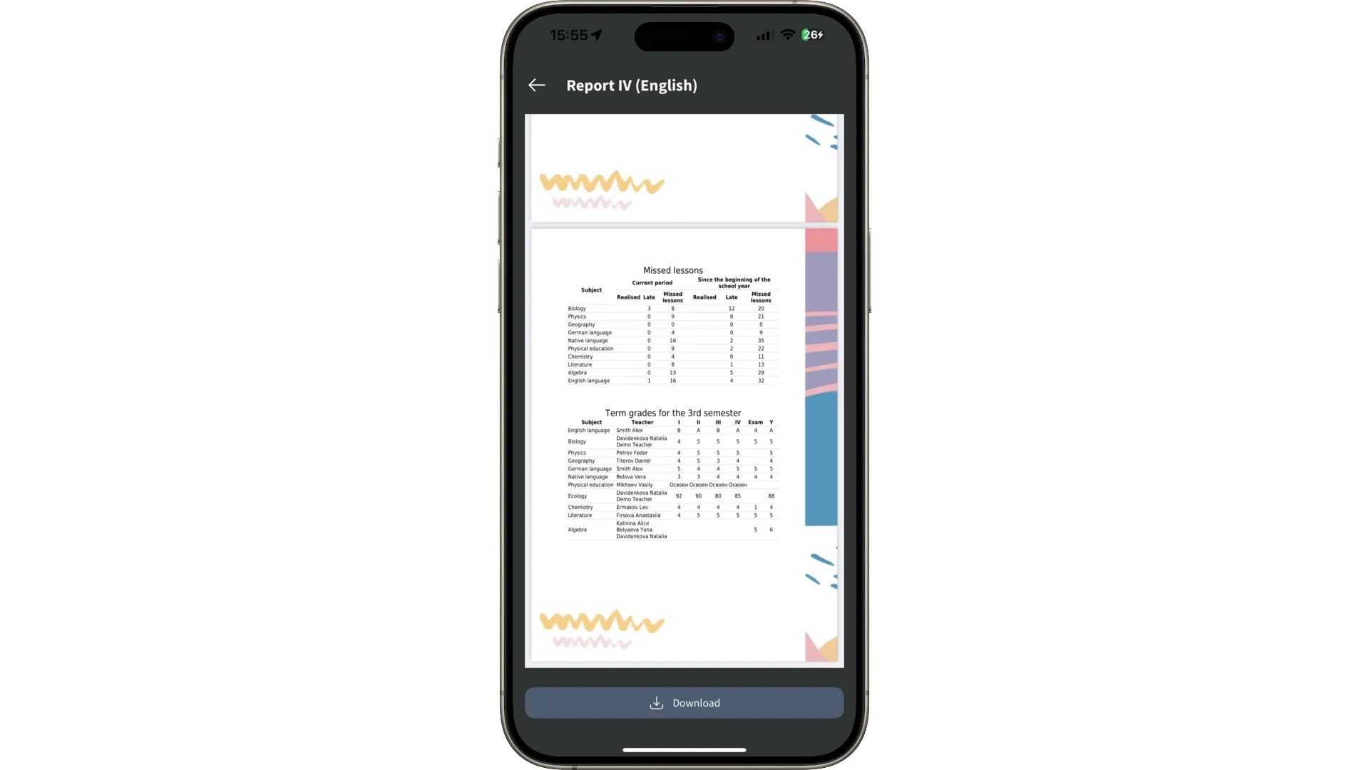 Graphs, charts, and filters by periods and subjects allow you to see learning dynamics.