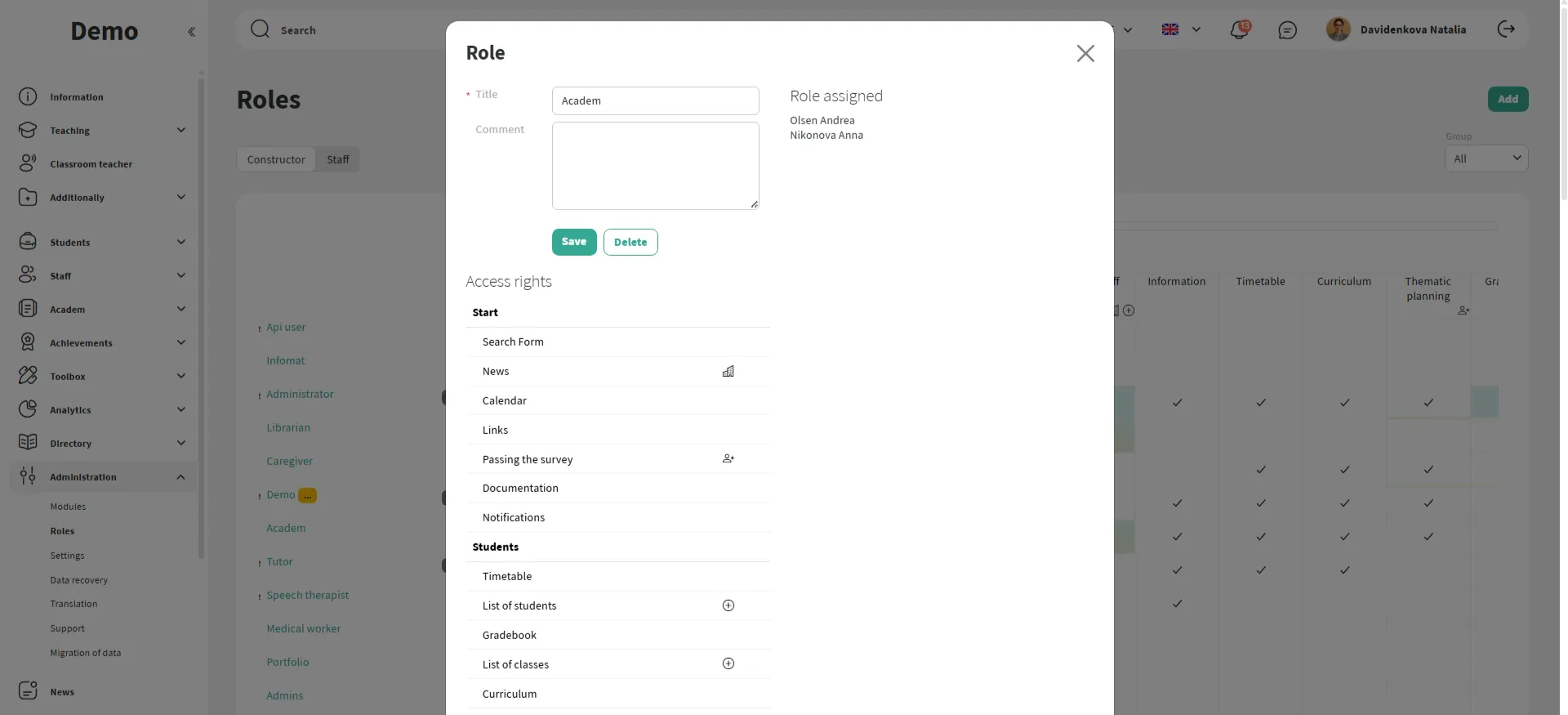 You can create any roles: deputy head, project coordinator, educational organizer, methodologist, etc. Each role is assigned permissions only for the modules it needs.