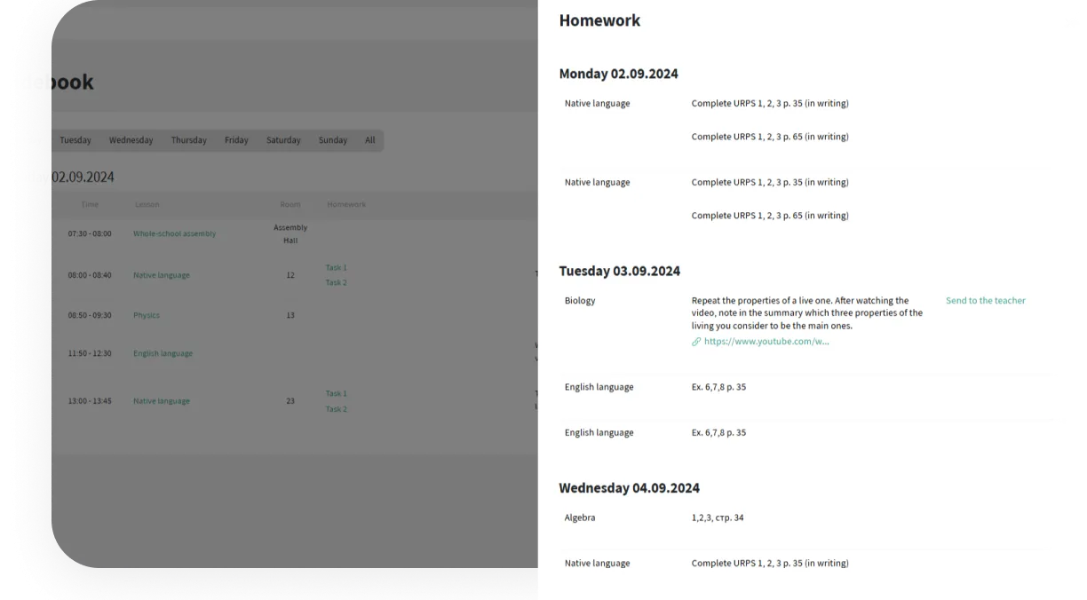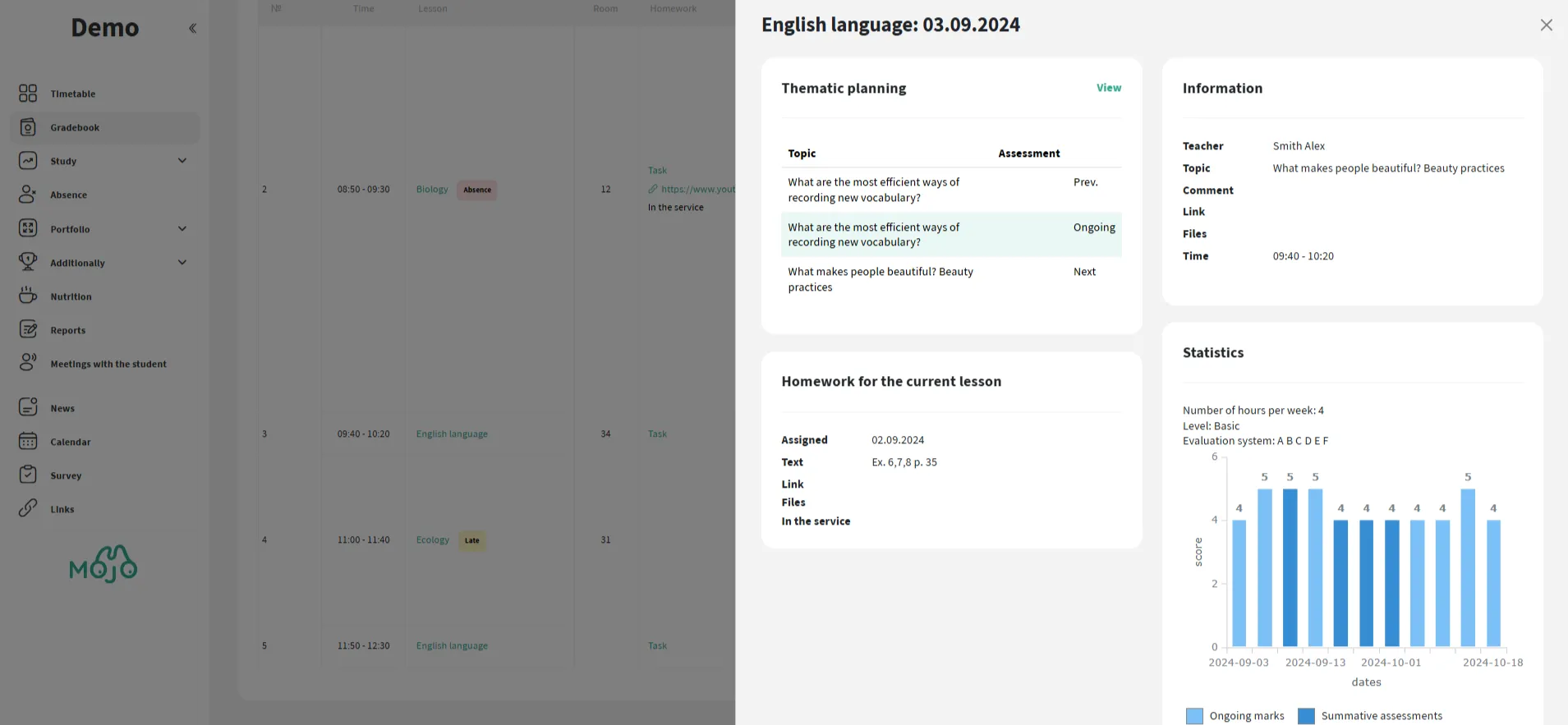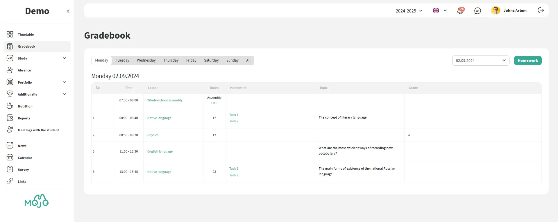 The gradebook shows the schedule, grades, lesson topics, and homework for each day or the entire week. Convenient for planning and monitoring.