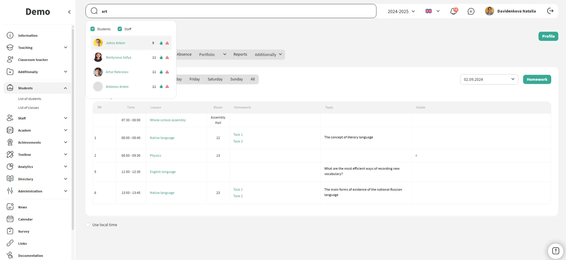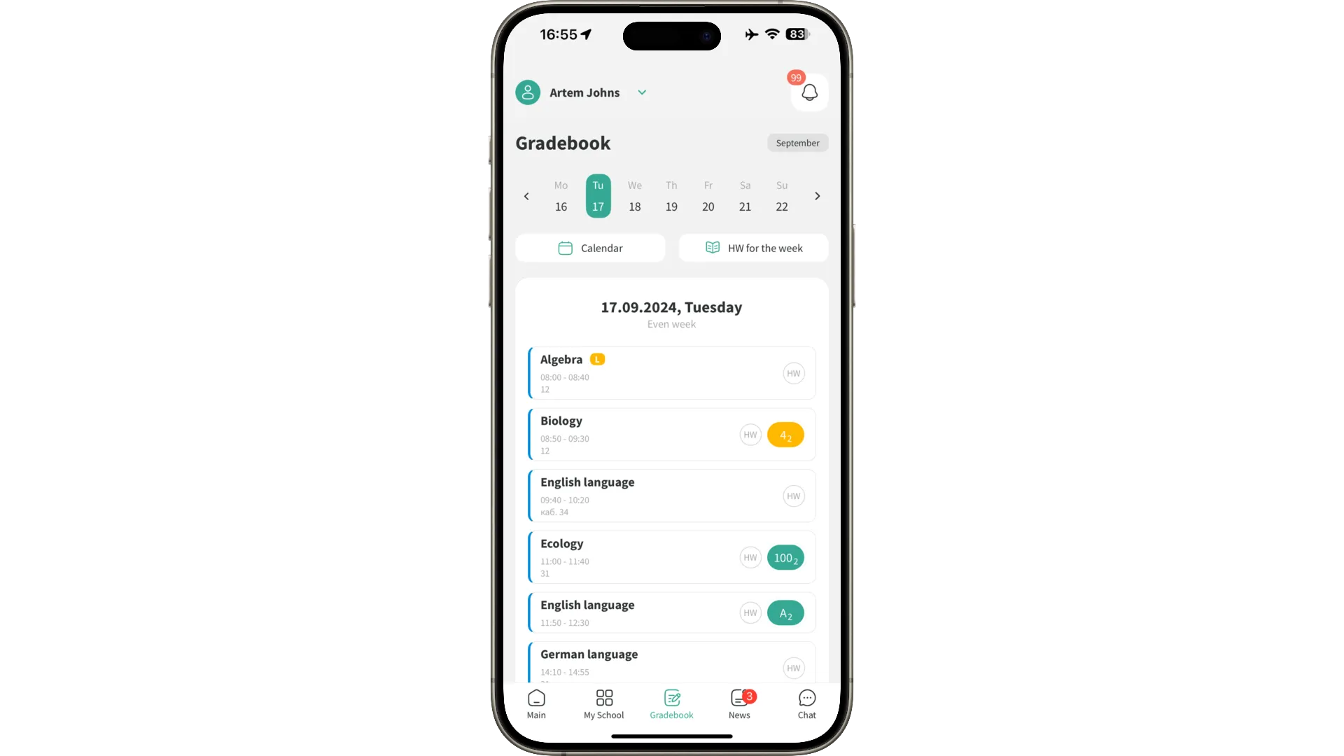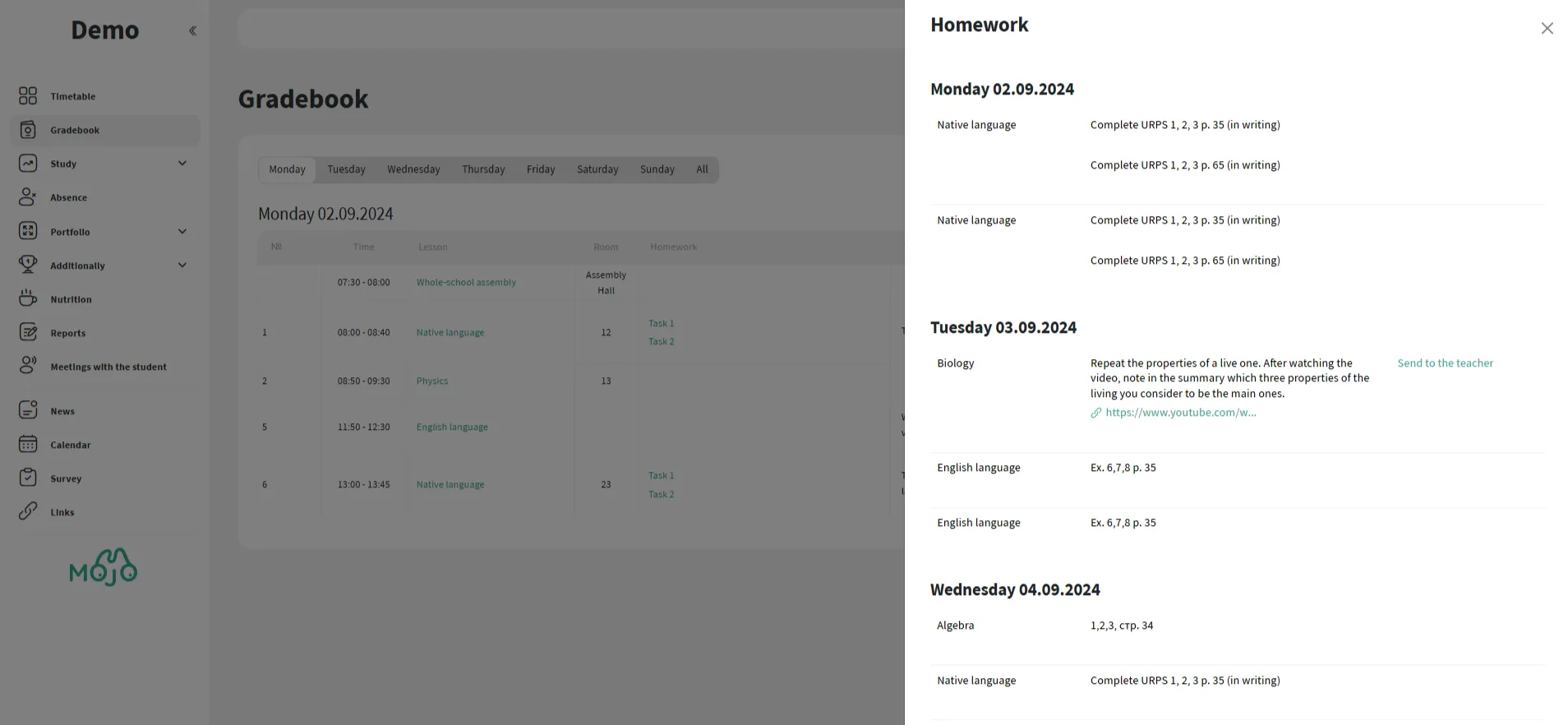 The gradebook shows the schedule, grades, lesson topics, and homework for each day or the entire week. Convenient for planning and monitoring.