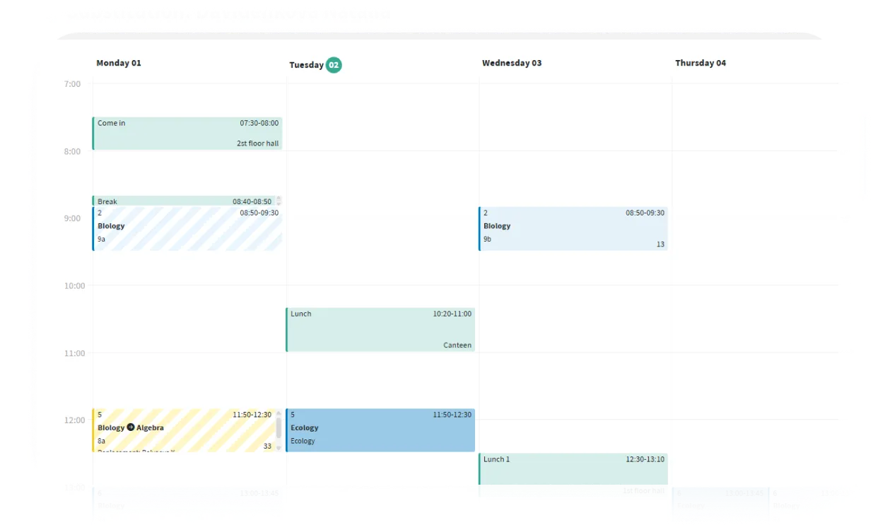 Create schedules easily by dragging and dropping cards. The system supports multiple buildings, various time grids, and parallel groups. Changes are instantly reflected for all students and teachers.