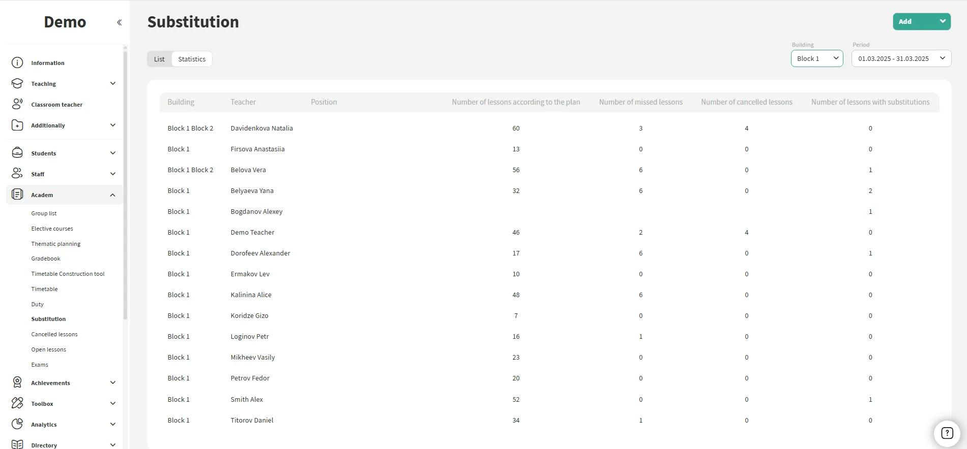 The system records every change. The administration can see how many lessons a teacher has conducted, how many substitutions were assigned, and analyze the workload.